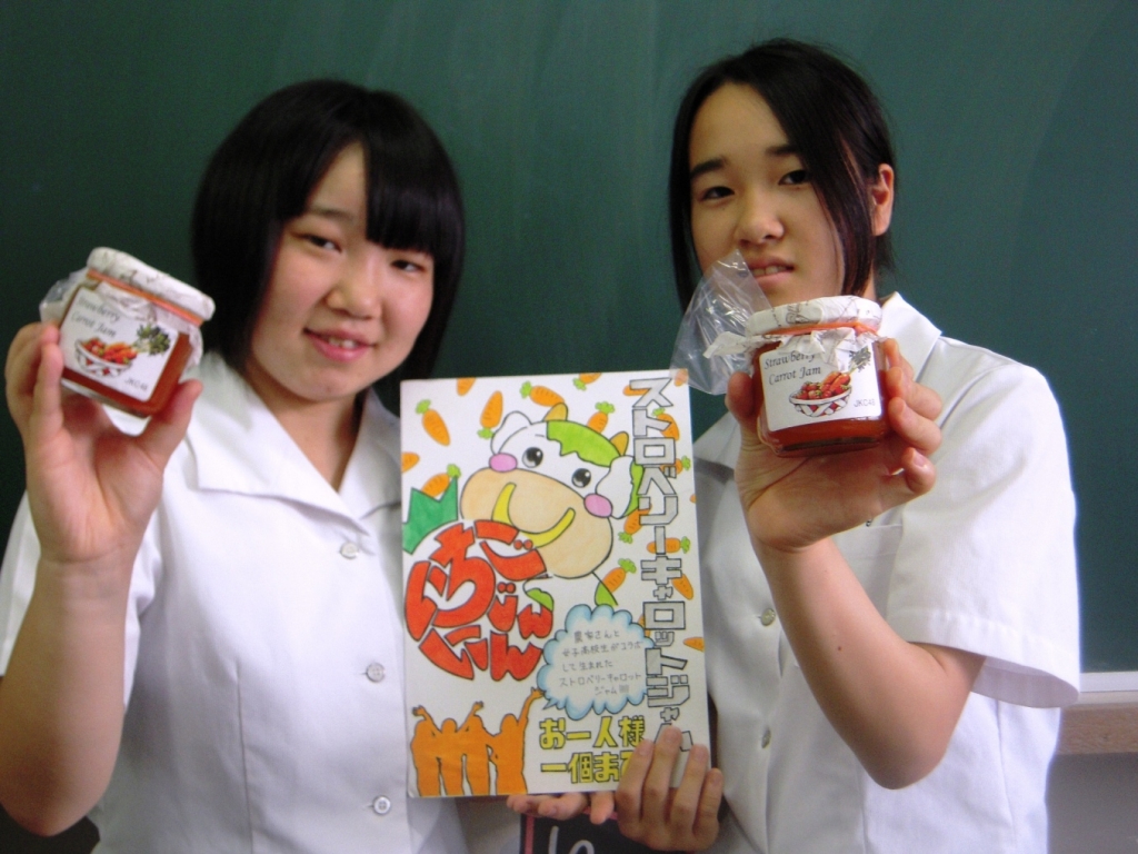 【食料・生産】 食品科学科3年 岩本さん、高波さん他4名「We love キャロット(JKC48)」~規格外ニンジンの変身物語~
