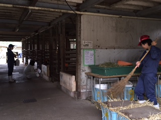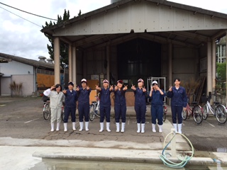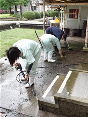 写真は生活経営科の2人です。職員とともに校内の外廊下の苔を落としたり、