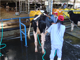 25日(土)に会場へ到着し、さっそく牛の体を洗い流し、体をきれいに仕上げます。