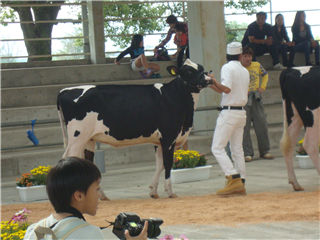 去る7月14日、本校「神殿原農場」を会場に、ホルスタイン種子牛の品評会「ベビーショウ」が開催されました。球磨・人吉の酪農家から40頭を超える子牛が出場したなか、本校飼育牛「キー ユーリー アレス」号が見事、グランドチャンピオンを獲得。写真(右下)は、この牛の飼養管理を担当している、生産科学科3年橋本眞子(山江中卒)さんとの記念ショットです。今後は、10月26日(日)に行われる県共進会に向け、調教・管理を頑張ります。
