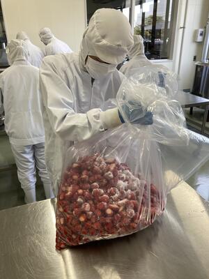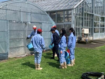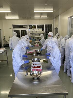 いちごジャムの原材料となるいちごの下処理を行いました。今年度もあさぎり町にある市岡いちご堂のいちごを使用します。市岡様には、長きにわたり本学科の取り組みに多大なるご支援・ご協力をいただいています。本当にありがとうございます。