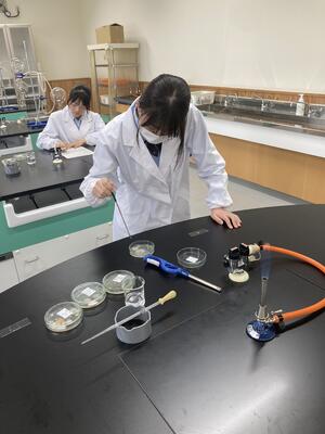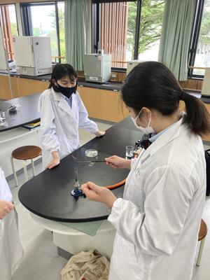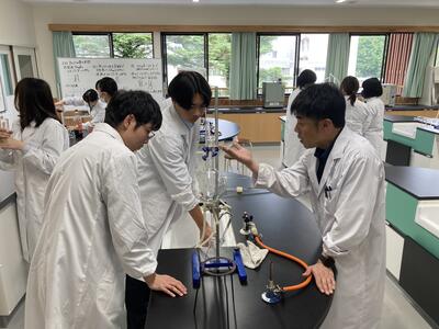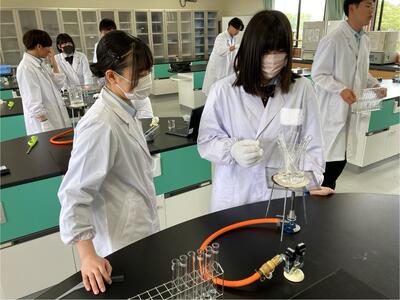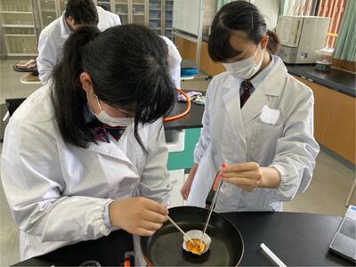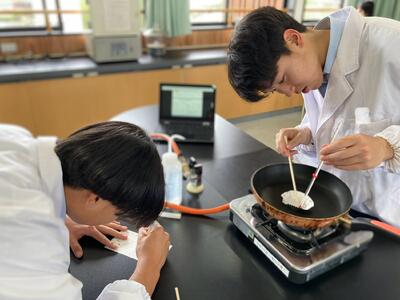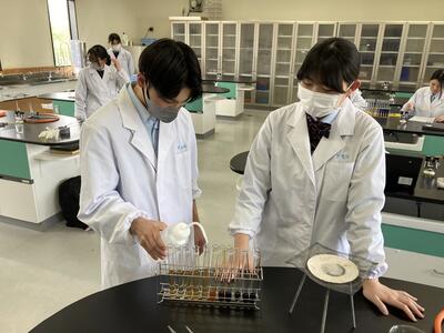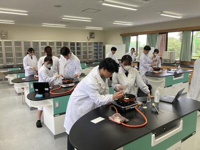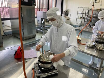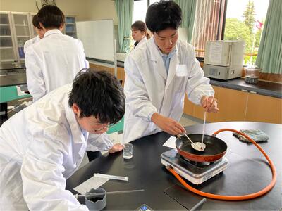 先月26日(金)に行った班が入れ替わり醸造ではアルコール蒸留を学び、食品化学ではカラメル化について学んでいます本日の様子です