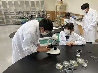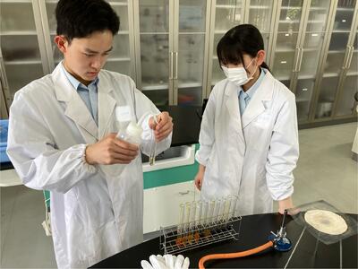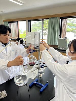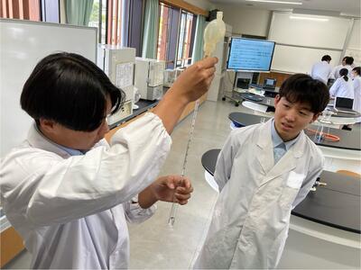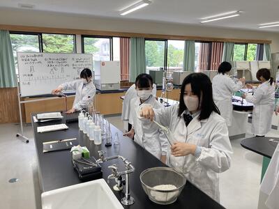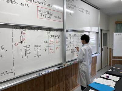 食品化学実験ではヨウ素デンプン反応実験を行い、醸造実験では、アルコール度測定を行いました