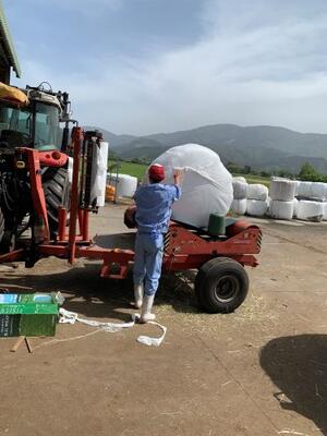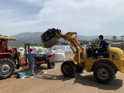 3年生の動物コース畜産専攻は神殿原(こうどんばる)農場で実習を行っています。今日は、牛の餌作りです。刈り取った牧草ロールを、専用のビニールで巻いていきます。こうすると牧草が発酵しておいしい餌になるのです。さすが3年生、実践的な授業です!