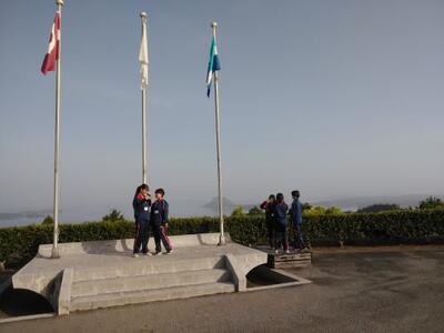 朝の集い、海の見渡せる素晴らしいロケーションです。