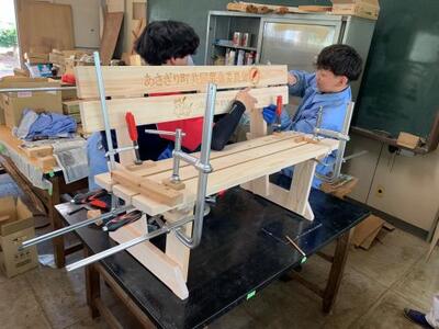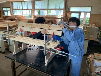 環境コース林業専攻性は、依頼を受けているベンチを作っています。部材の加工が終わり、いよいよ組み立ての作業に入ります。ズレが出ないようにクランプで止めながら慎重に作っていきます。