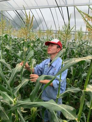 これは植物コースの野菜専攻生が育てているトウモロコシです。今日は、大切な受粉をさせる日です。(中学生の皆さん理科で習いましたか?)トウモロコシは、上に雄花があり、下に雌花があります。生徒たちは、株を揺らして雄花の花粉を落としていきます。これでおいしいトウモロコシが育つのです!!!