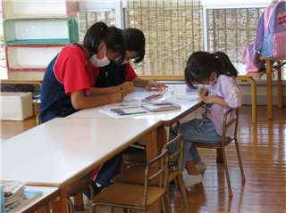 ボランティア部員による参加者募集の呼び掛けのもと、放課後に学校近くのるり光保育園の手伝いに行きました。7日(水)には1年生5人、14日(水)には1年生1人と3年生5人が参加しました。