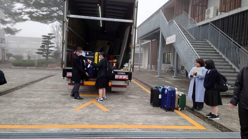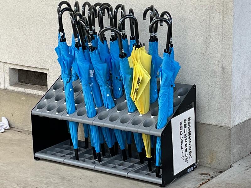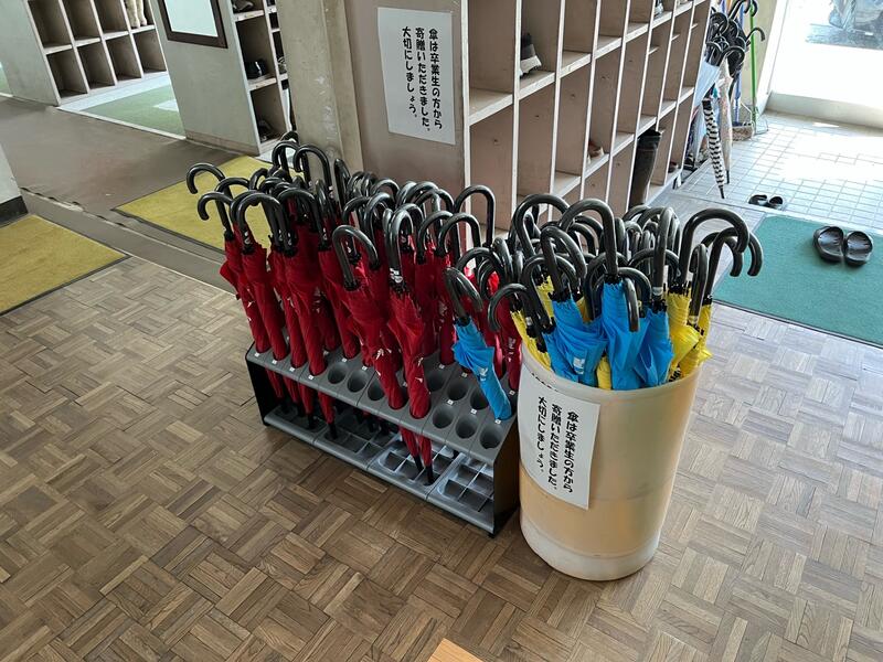 実はこの傘、校内外の移動が多い本校教育活動をご存じの卒業生が、150本の傘を寄贈していただいたものの一部になります。この日のような雨が降ったり止んだりする天気のとき、生徒はほとんど傘を持ってきません。今まで、濡れてしまった生徒もたくさんいたことでしょう。今年は強い味方、傘が助けてくれました。
