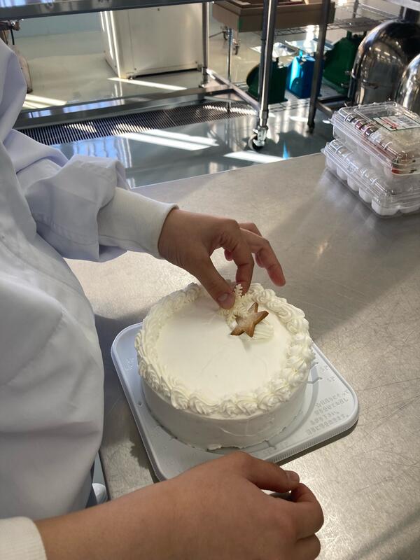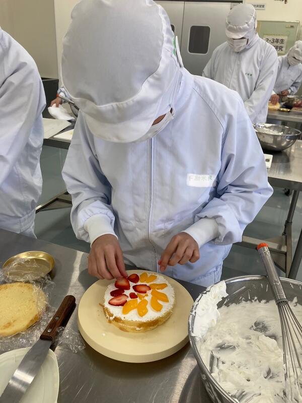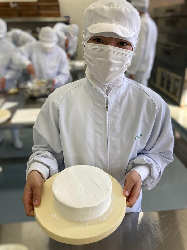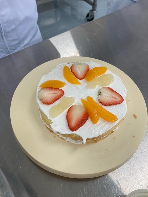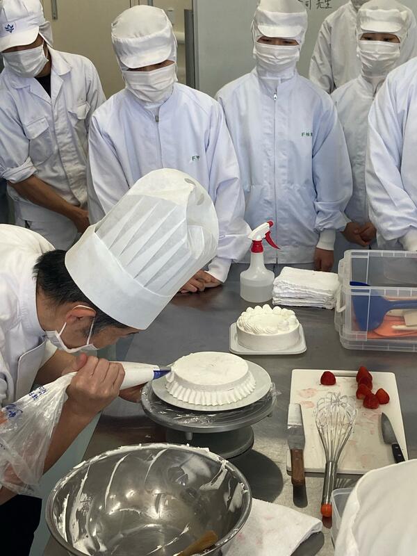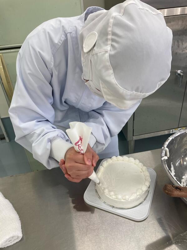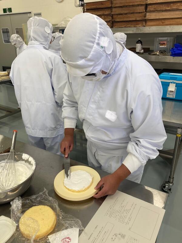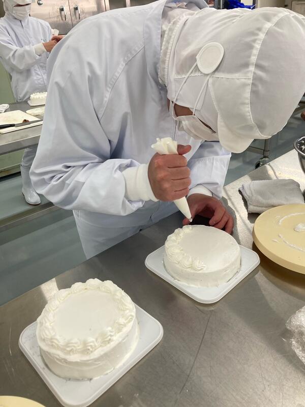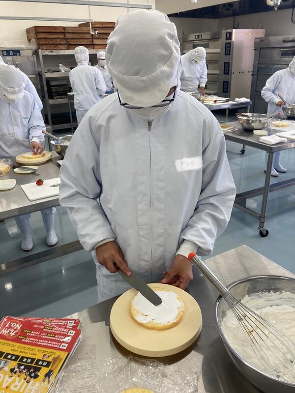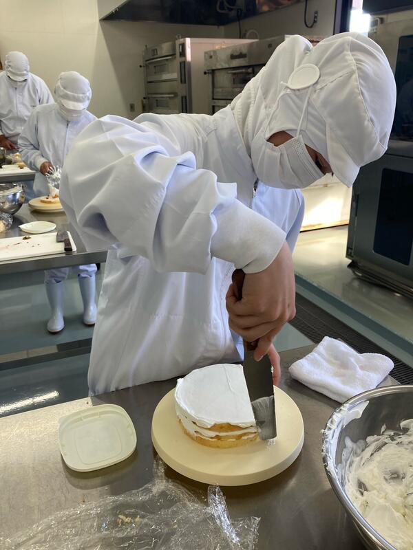 ここからが難しくもあり、大切なところです。上部に生クリームを薄く敷き、側面も整えていきます。先生方に教えてもらいながら丁寧に取り組みます。