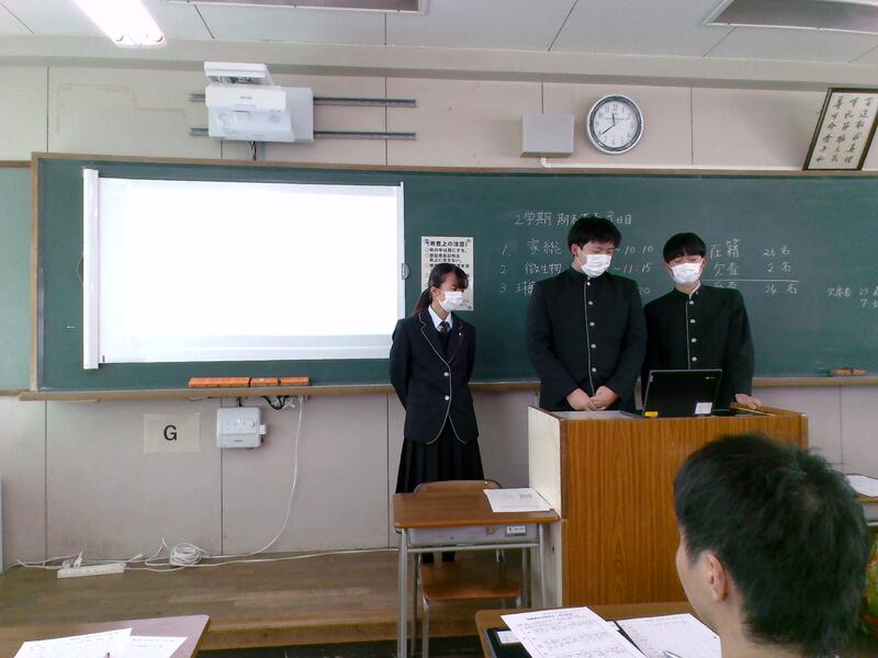 2学期終業式後に、今年度熊本で開催された日本学校農業クラブ全国大会の準備、運営、大会の様子を全国大会役員4名の生徒がスライドにまとめ、報告しました。