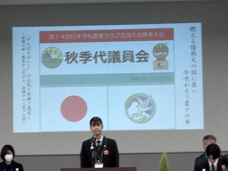 10月25日に山鹿市の山鹿市民交流センターにおいて、第74回日本学校農業クラブ全国大会熊本大会の意見発表会が行われ、九州代表として、2年総合農業科の池上姫加梨さんが分野1類に出場しました