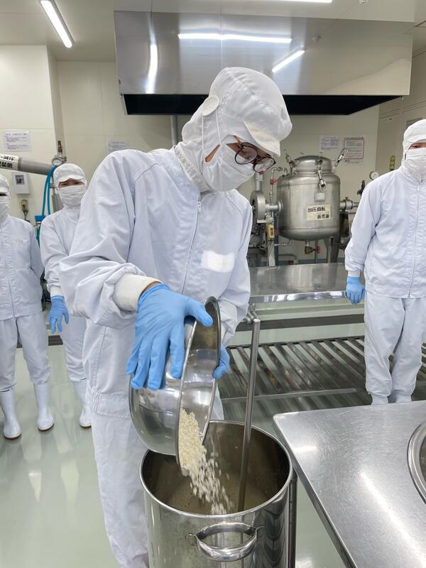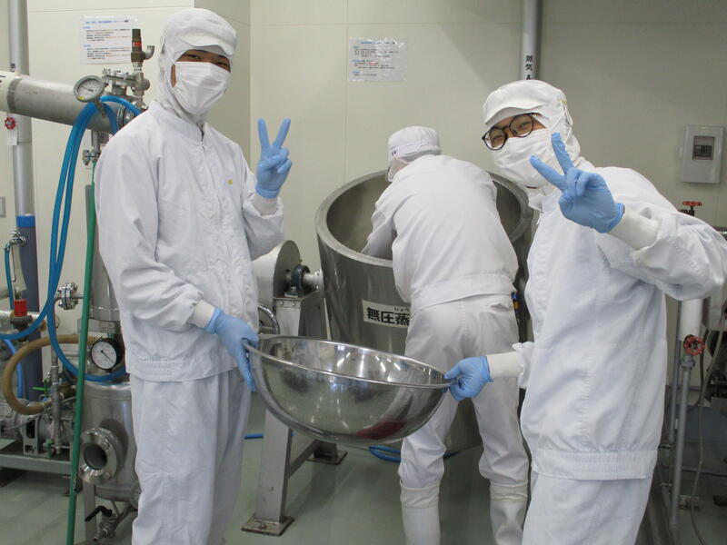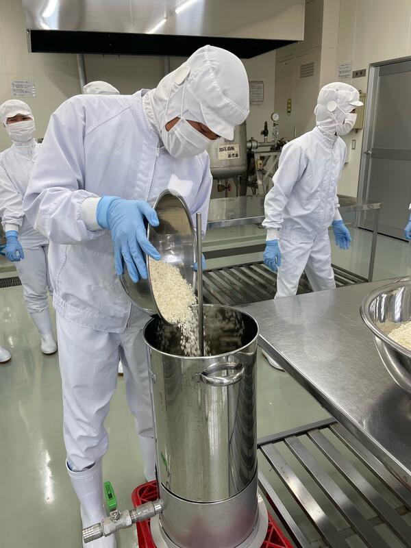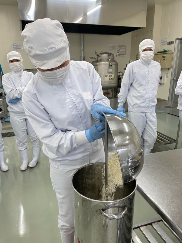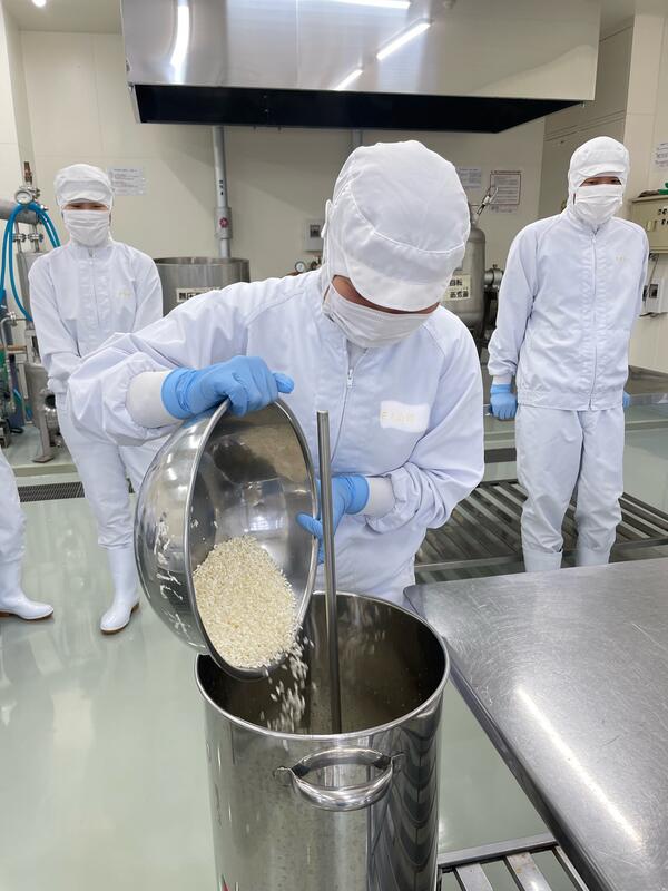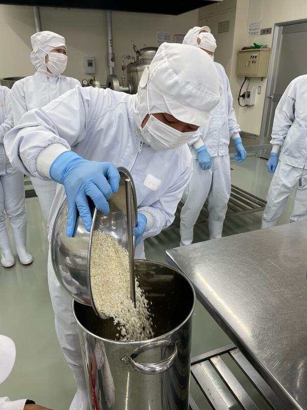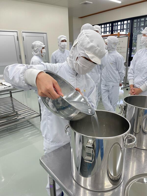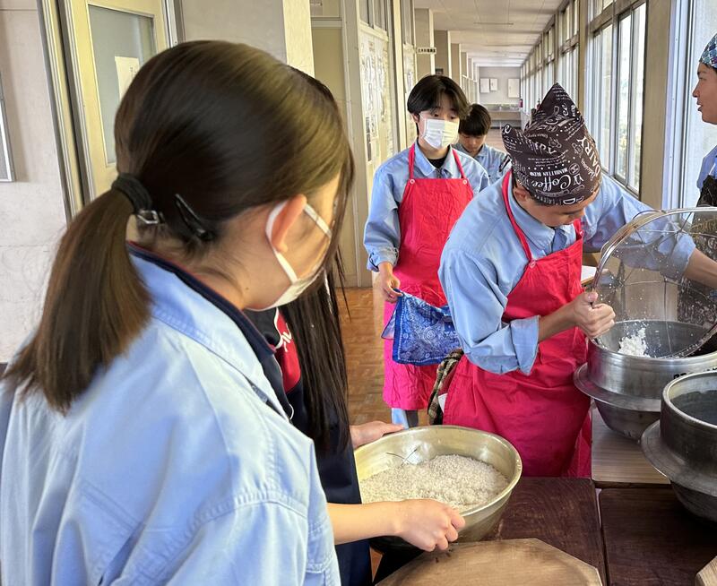 現在食品科学科3年生では、醸造の授業において卒業前の集大成でもあるプラント焼酎製造実習を行っています。18日には班員と協力して、製麹機に入れる前の下準備をしました