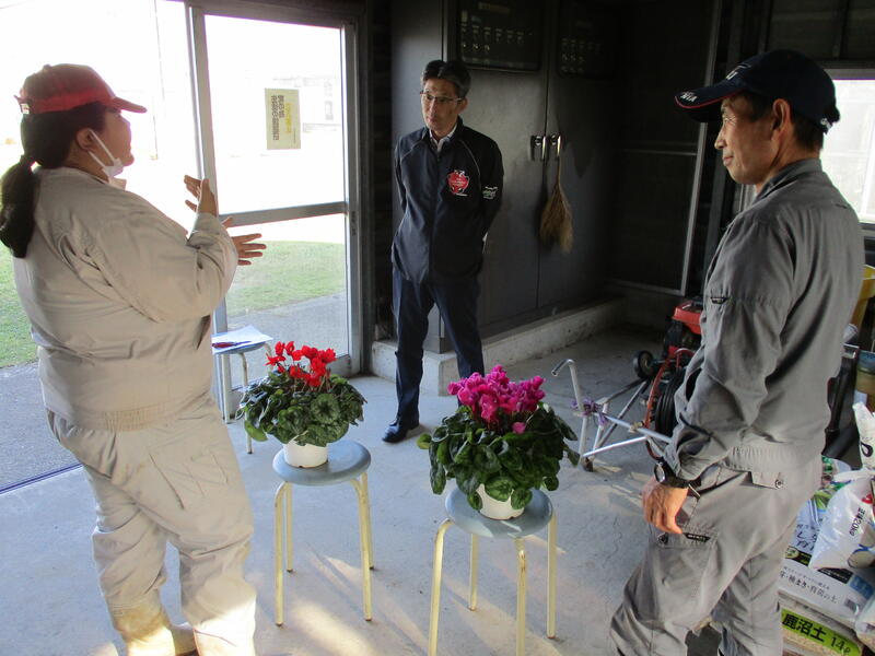 【農業(草花)】教頭先生も交えてシクラメンを観察しています。