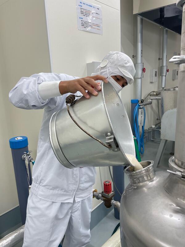 それから3日後製麹を終え次の行程に移ります。製麹機より取り出し、計量します。次に汲み水、酵母液を足し米麹を保存容器に移します。