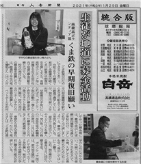 ○毎日新聞福岡県版夕刊「九州豪雨 くま鉄よ、走れ 復旧へユウキ コイン募金 通学高校生から輪」(令和3年(2021年)1月23日 西部夕刊)