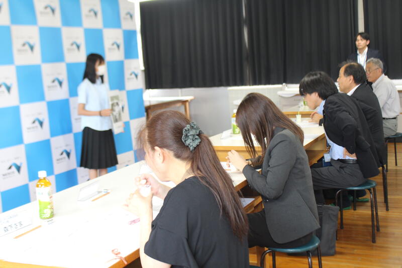 面接官は進路キャリアアドバイザーの深町先生、育友会会長 平野 様、育友会役員 東 様、竹田 様です。