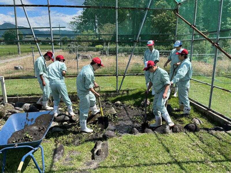授業では動物とのふれあいや飼育管理をとおして学習を深めます。現在は犬小屋の屋根修理を行っています。