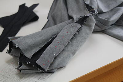 デニムセットアップ作りを行う生徒は、上衣のシャツを完成させました