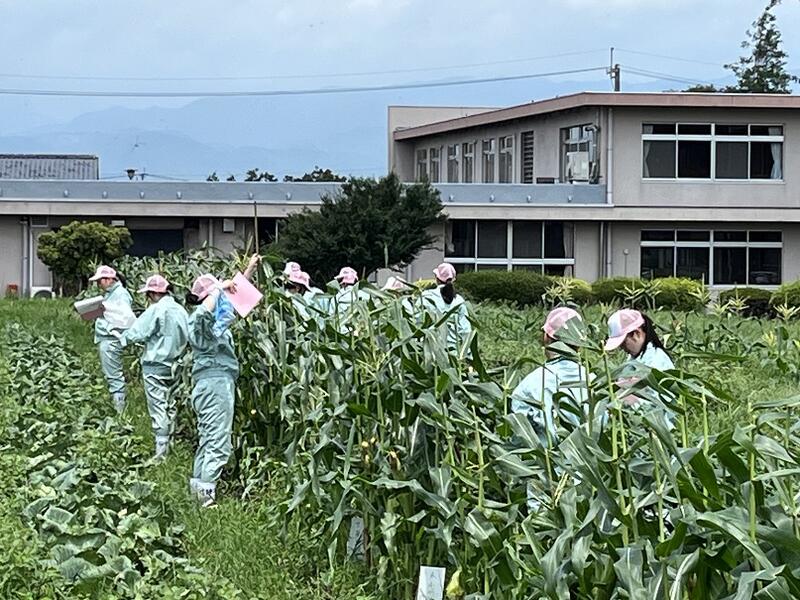 1年生活経営科は農業と環境の授業でキャベツ、スイートコーン、ピーマンを栽培しています。先日、収穫をしました。