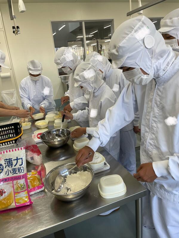 通常の授業では時間が限られてるため、器具の準備、材料の計量は実習専門職員が行いますが、今回は自分たちで計量します。計りにてg数を手際よく正確に合わせるのは以外と難しいのですが、前向きに挑戦しています!