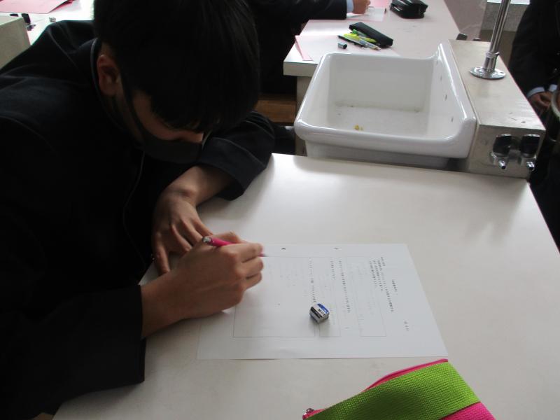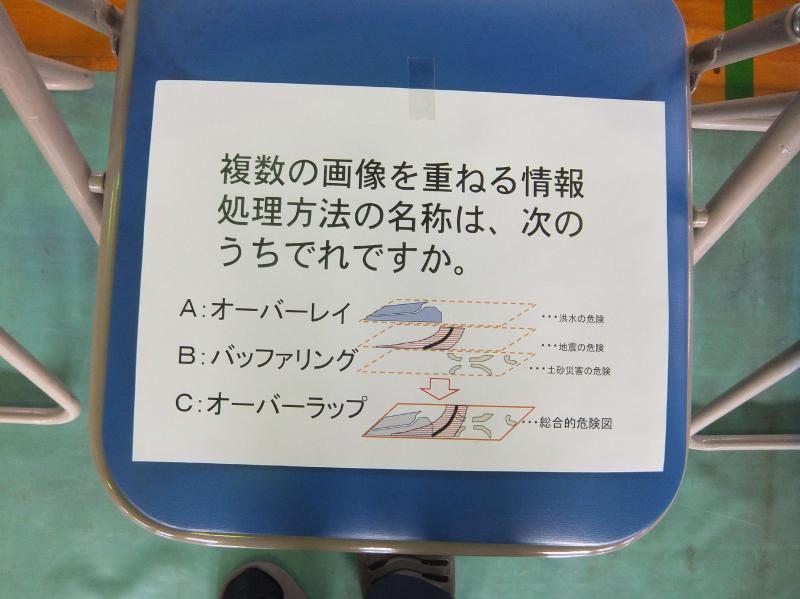 体育館に並べられた椅子には問題文や写真、実物が置いてあり、生徒は問題を見て、解答用紙に答えを記入していきます。
