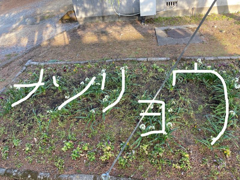 ④実は③の写真ですが、水仙を「ナンリョウ」になるように配置して植えつけを行っています。私は当事者なので、しっかりと「ナンリョウ」が見えますが、皆様はいかがでしょうか。③と④の写真を見比べてみてください。