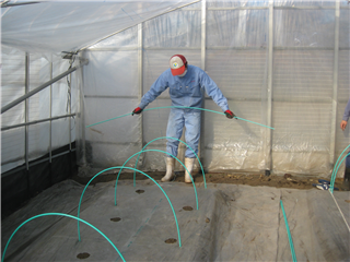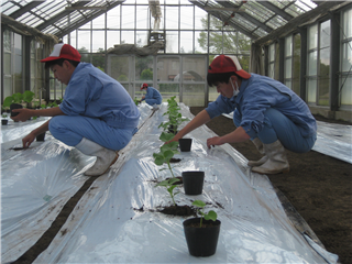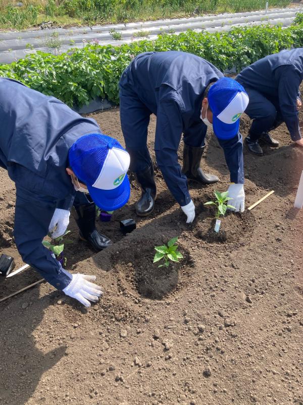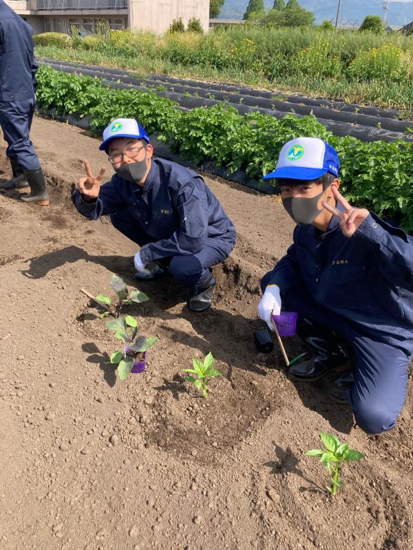新しい実習服を着て、ナス、ピーマン、スイートコーンを栽培するためのうね立て、マルチ張りを行いました。