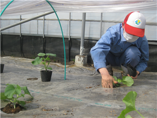 定植本番。美味しいメロンになることを願って「向きを揃え、浅植えにして」といっても練習はありません。これからも、経過を観察します。乞うご期待!!