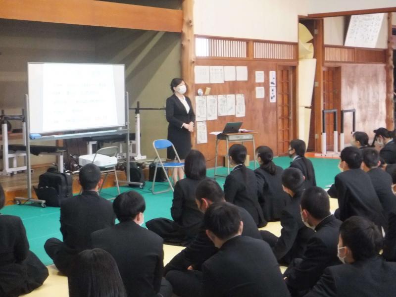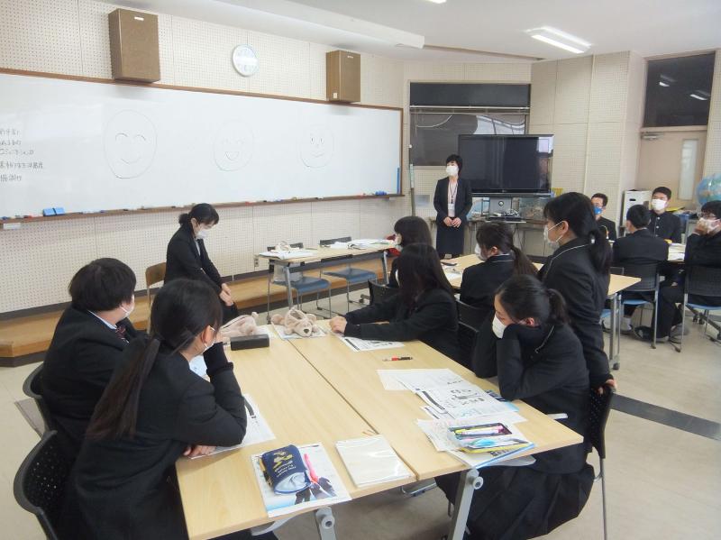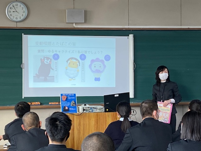 2月25日(木)1限目1L、2限目1A、3限目1Fの「保健」では、【学校保健連携事業(たばこ・受動喫煙の害)の普及啓発に関する出前講座】として人吉保健所から2名の職員様にご来校いただきました。今年度は、全校生徒一斉による性教育講演会等が実施できなかったため、クラス単位で出前講座をしていただき、大変有意義な時間を過ごすことができました。「喫煙と健康」「性感染症とその予防」について講話・解説等をしていただきました。