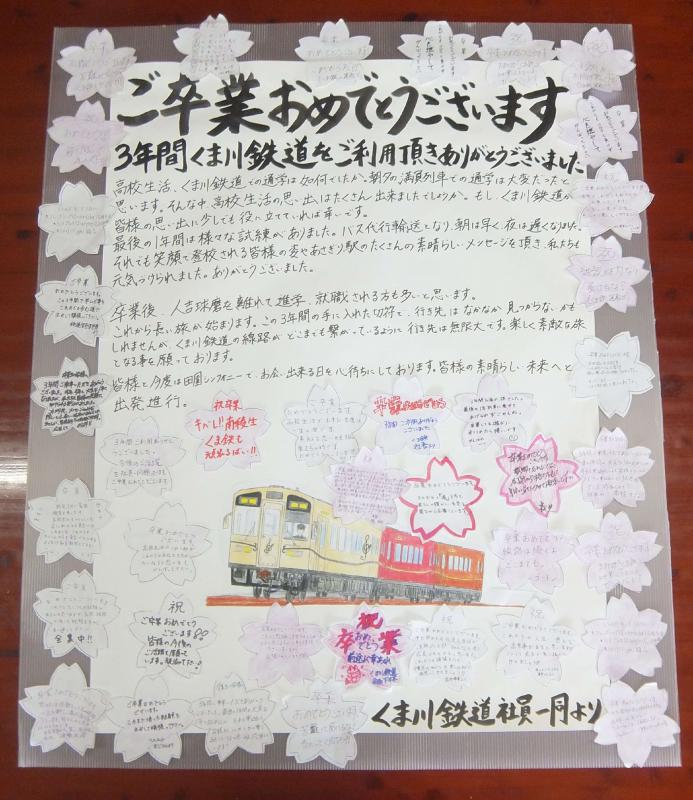 卒業式に向け、くま川鉄道の皆様から真心のこもった手作りメッセージボードをいただきました。