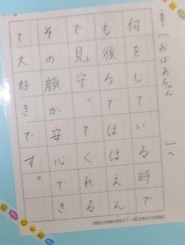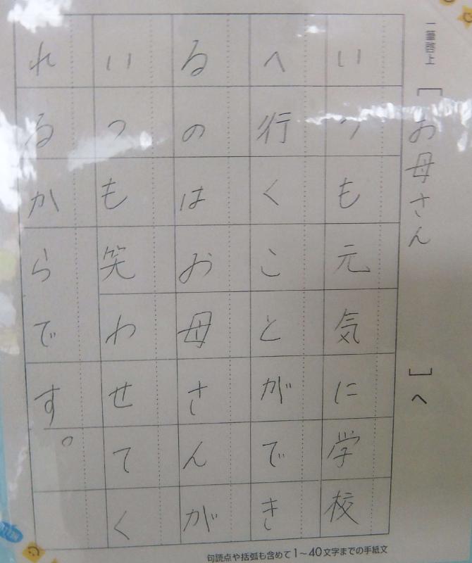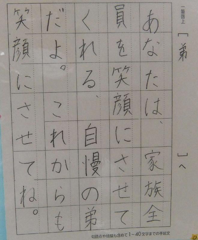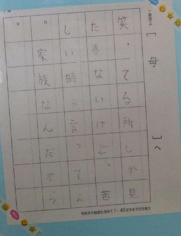 文章にはいろいろな種類がありますが、短い手紙も立派な文章です。家族への感謝の気持ちなどが素直に述べられていました。