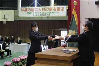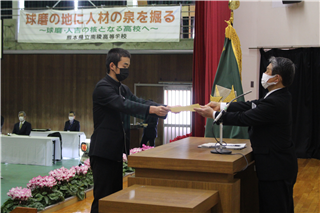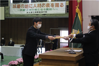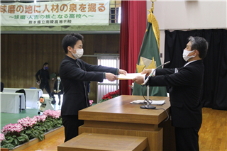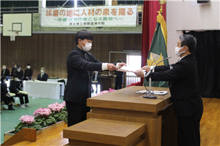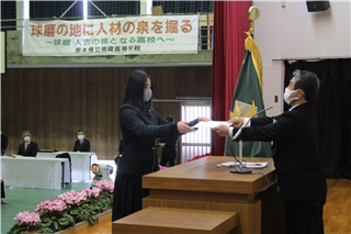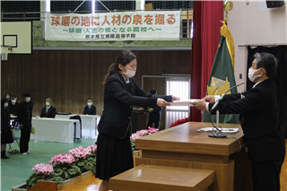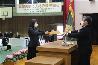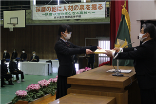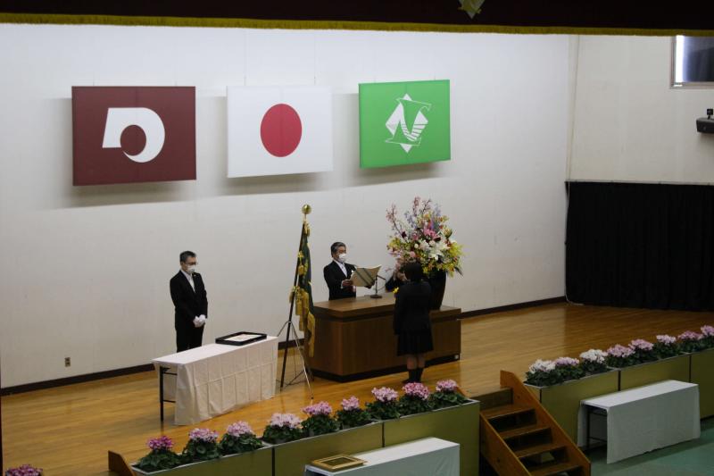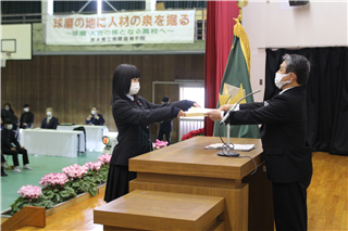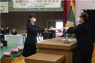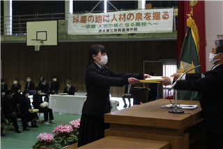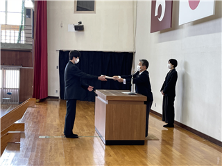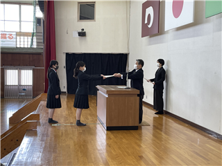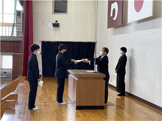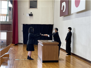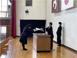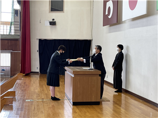 卒業証書授与 担任が生徒を一人ずつ呼名したあと、クラス代表生徒が卒業証書を受け取りました。