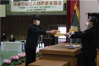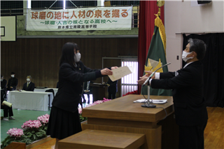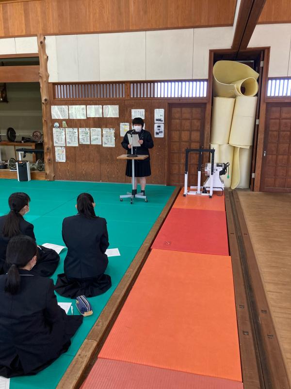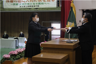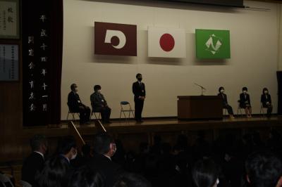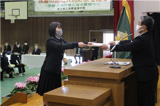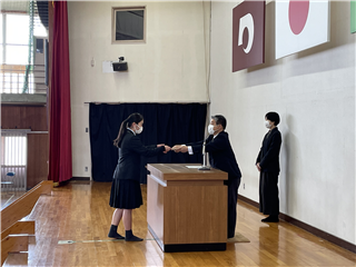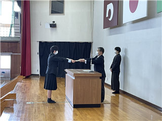 会に先立ち・本学年の生徒会長を務めた北川さんに神殿原賞が授与されました。