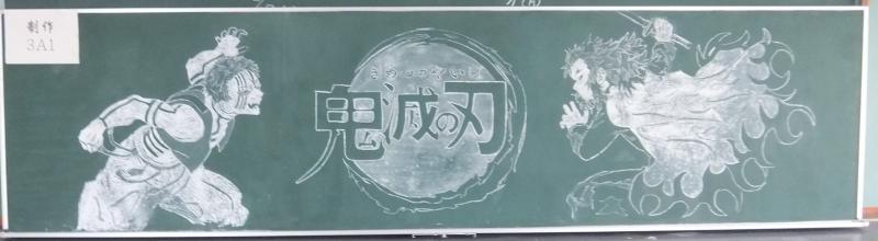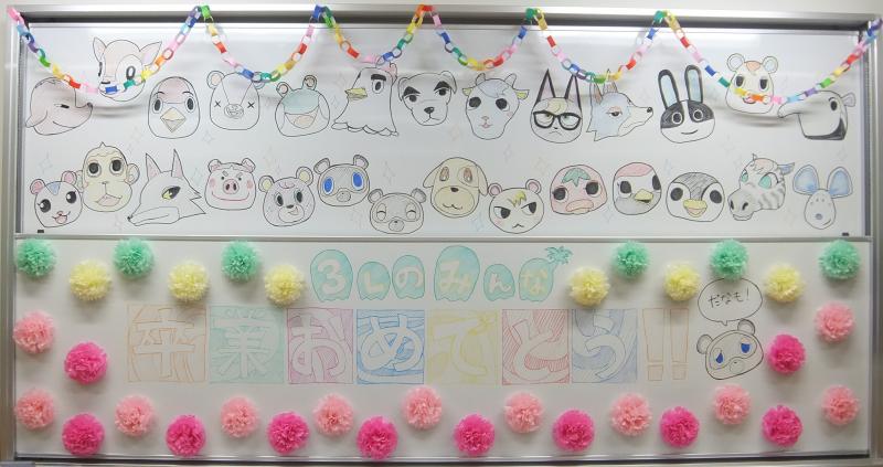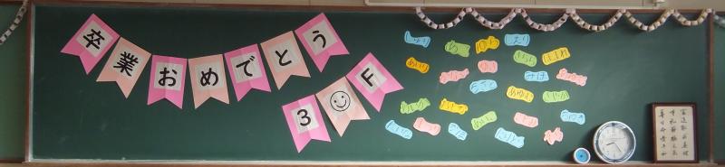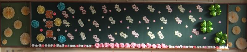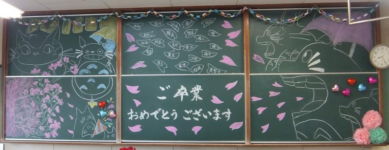 卒業生に向け、在校生や先生方が教室黒板に「おめでとう」のメッセージやいろんな絵を描いて卒業をお祝いしてくれました!