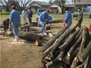 まずは、チェーンソーで約100~120cmほどの長さに切り、リヤカーで運搬します。