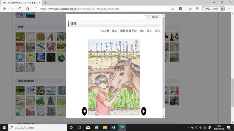黒木さんの作品は、馬術部での活動を背景とした絵が印象的な友人へのメッセージとなっています。