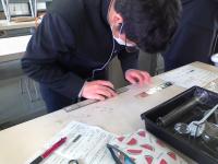 木材に鉛筆で線を引く段階では、何度間違えても修正がききますが、ノコギリで切り込みを入れると元の形に戻すことはできません。丁寧さと正確さが求められます。生徒は慣れない作業に慎重になっているようでした