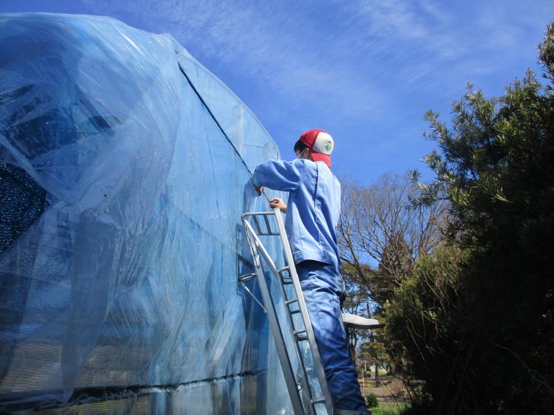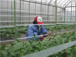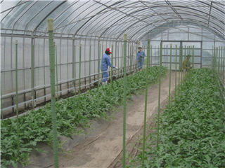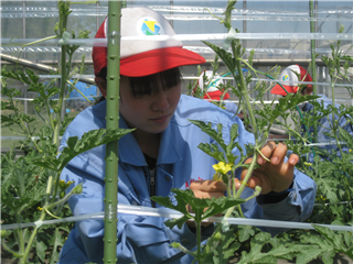 トマトは梅雨時期に露地で育てると病気になりやすいため、温室で育てます。成長過程を観察しながら、おいしいトマトを育てます。