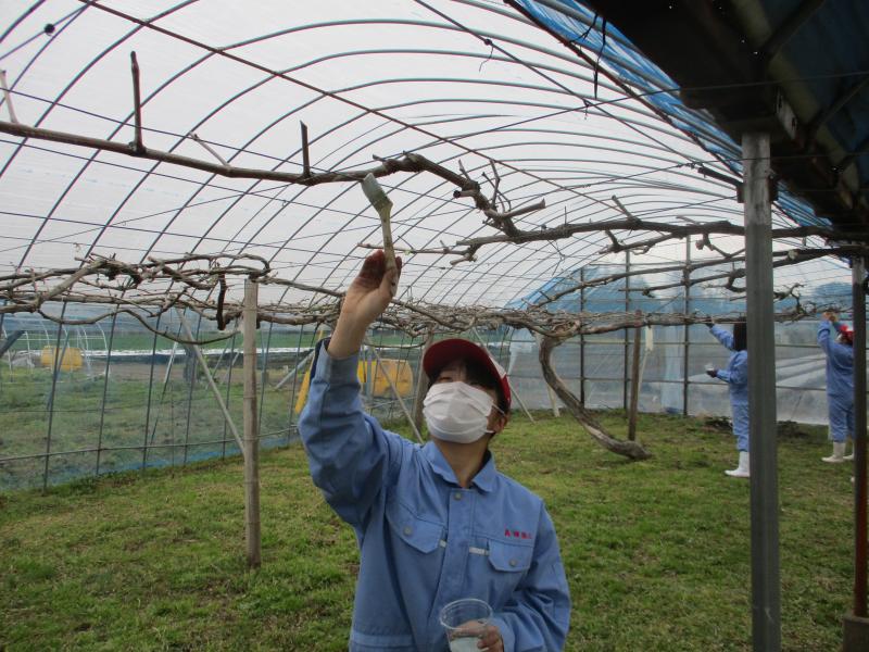 スイカの交配です。ミツバチに変わりせっせと行い、目印の毛糸を結びつけます。