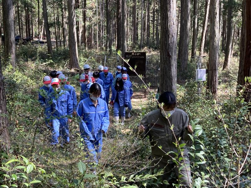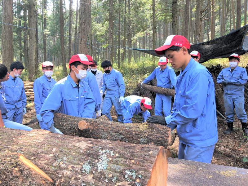 その後、林業の先生と、環境コースの2年生を中心に駒打ちスタート。体育コース、総合農業科の動物コース・植物コースの生徒は初体験。全てが初めてで興味津々。黙々と実習に取り組みました。