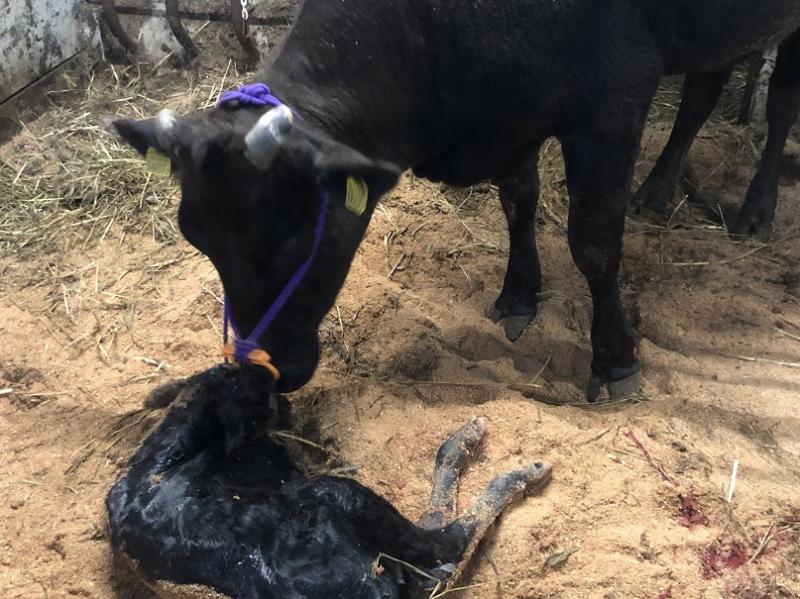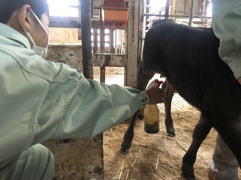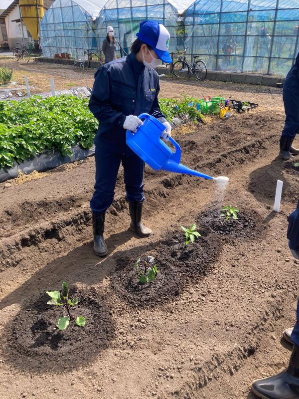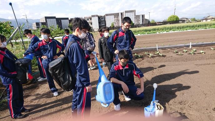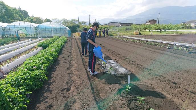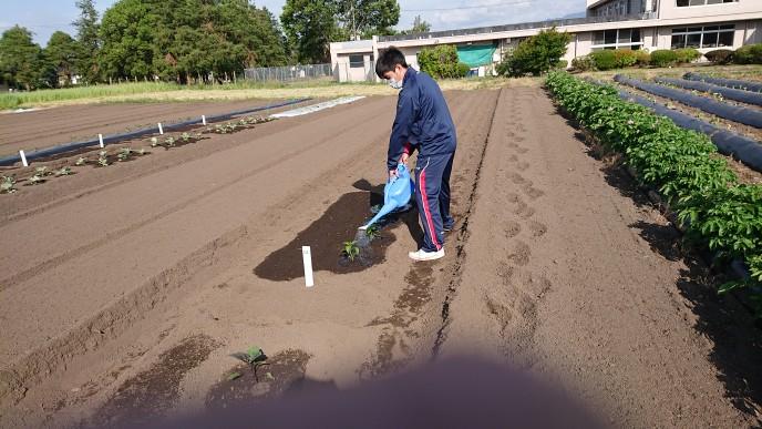 土曜日の朝、部活の前に農場へ立ち寄り、定植したばかりの野菜の苗にかん水しようとするバレー部、弓道部の1年生がいました。