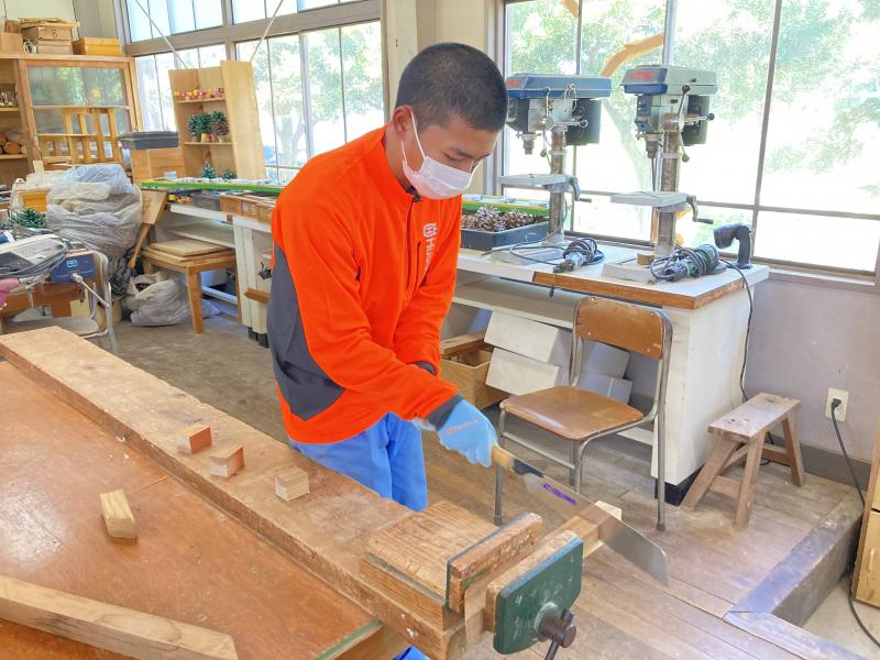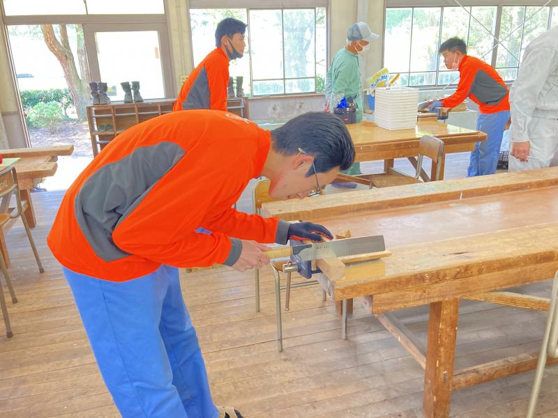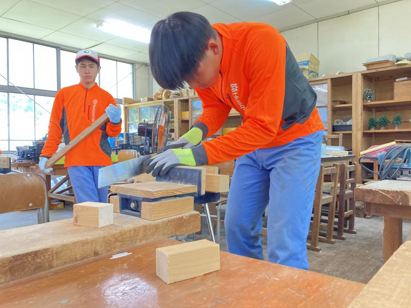 総合農業科3年環境コースの林業専攻の6名は南稜祭での木製品販売に向けて、木材加工の技術向上に励みました本日の林産物利用の授業では鉛筆で引いた線に沿って木材をノコギリで切断する練習を行いました