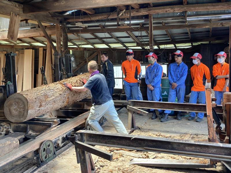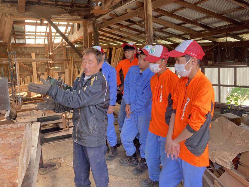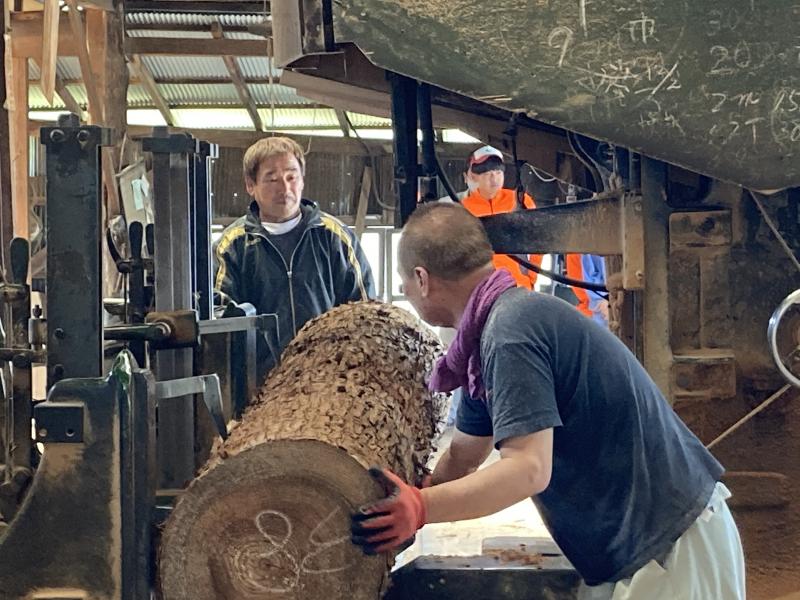 善社長からは、木材には一つひとつ性格があり、木の性質を見極めて製材することが大事なこと、機械化されている今日においても、このような大木は人の手でなければ製材できないことなど詳しく学ぶことができました