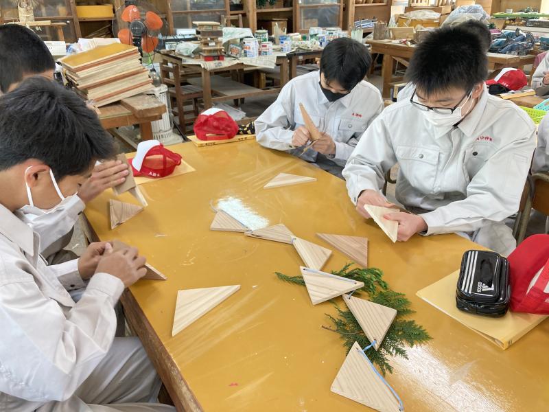 総合農業科1年2組の皆さんは、総合実習の授業でスギ材とヒノキ材のガーランド製作を行いました初めに林業専門で担任の中村先生から木材の温かみやスギとヒノキの特徴の違いについて教わりました