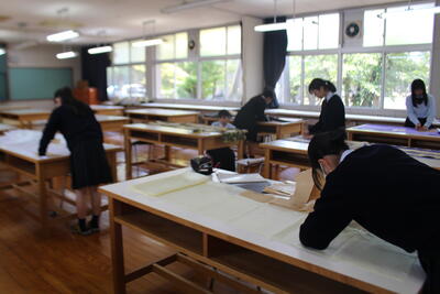 「平面の型紙」から「立体的な完成形」を想像しながら作業を進める3年生、さすがですね