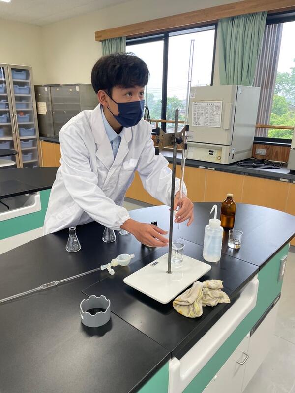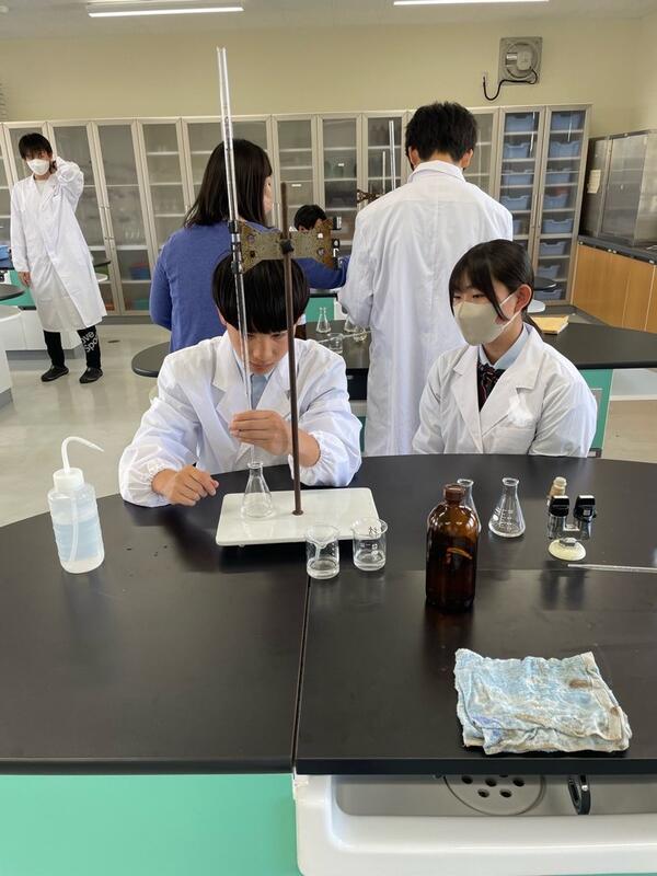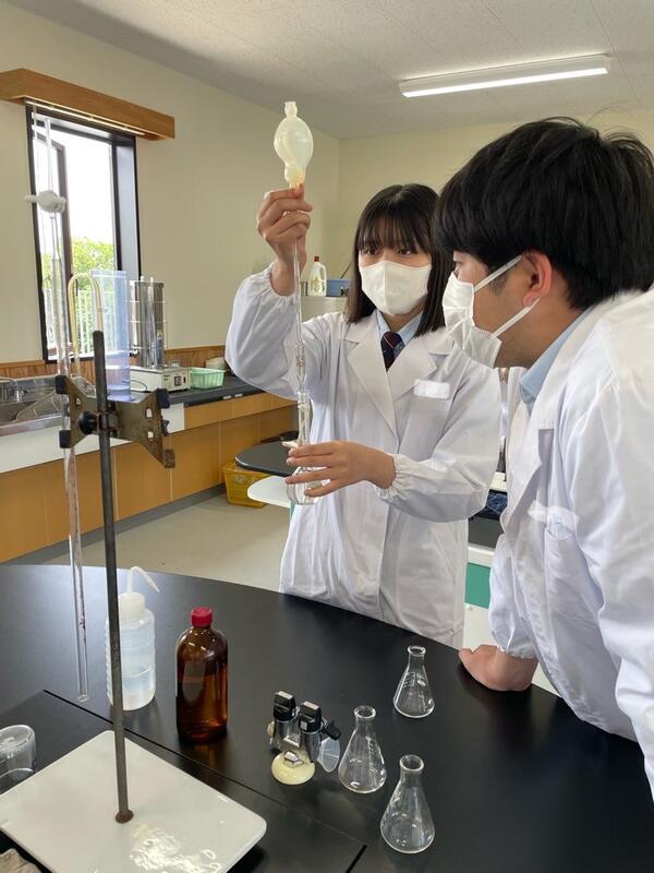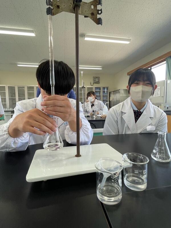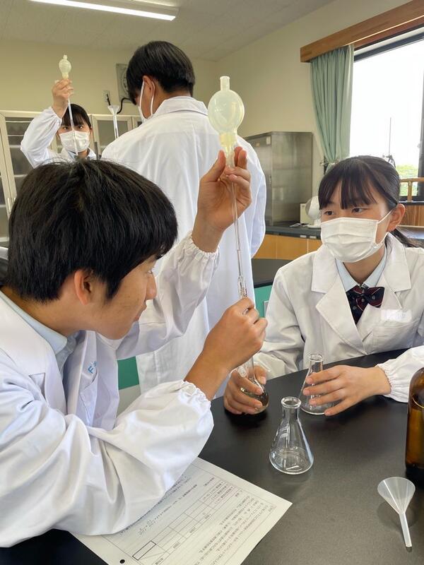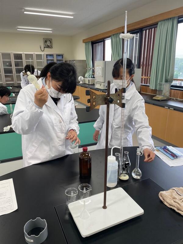 本日の5、6時間目に前半組が販売用いちごジャムの製造実習を行い、後半組が食酢の酸度測定を行いました。今日は化学実験の様子をご覧ください。