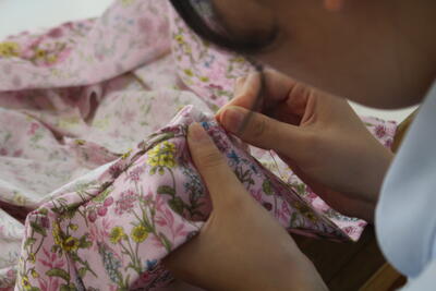 まつり縫いは、表目0.1cm裏目0.5cmという細かい規定を守って縫っています
