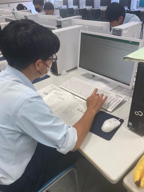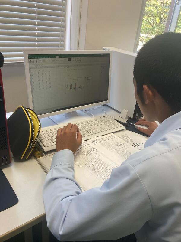 表を作成し、グラフを作り、タイトルの編集や凡例の付け方、編集など先生に質問したり授業プリントをみながら取り組んでいました