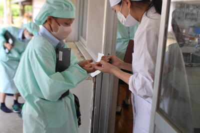 学年カラーの調理着に着替えたら、爪のチェックを受けて調理室に入ります